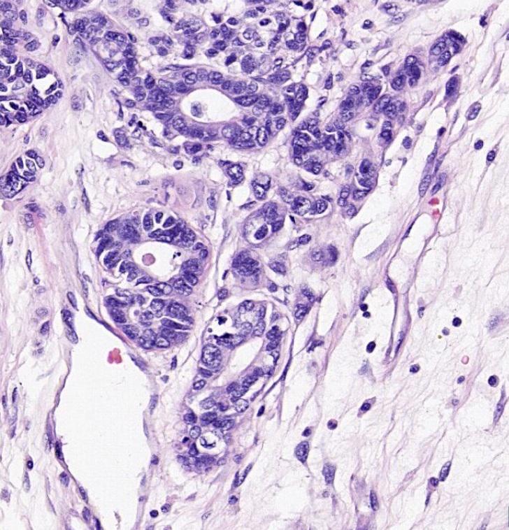 图 1 肿瘤细胞排列成实性巢团样,细胞核形状不规则,染色质浓密,有小核仁,细胞浆丰富透明HE(染色,中倍镜)