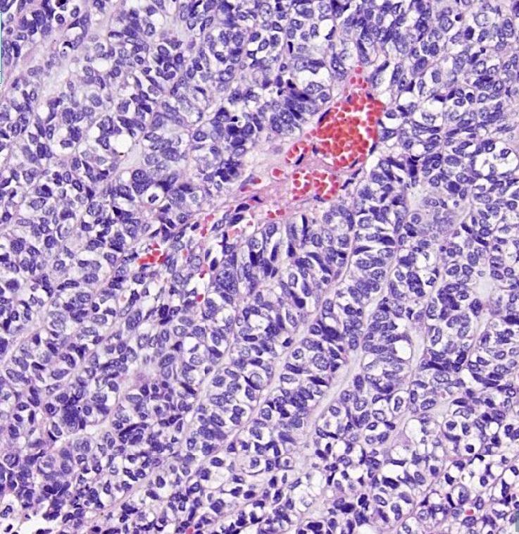 星形母细胞瘤是一类罕见的中枢神经系统肿瘤,在2016年WHO分类内并不清楚其特征性的遗传学异常。其组织学常形成围绕血管的放射状菊形团,称为“星形母细胞性假菊形团”。在横切面上表现为乳头状或假乳头状结构,类似转移性乳头状癌。在文献报道内也确有肿瘤细胞部分表达上皮性标记物CK, CAM5.2及EMA。在2021 CNS-WHO分类以前,伴MN1异位的星形母细胞瘤也被称为伴MN1异位的中枢神经系统高级别神经上皮肿瘤[4],儿童及青少年相对常见,肿瘤一般位于幕上,中位年龄16岁(年龄范围5~40岁),女性发生为主,存在转录共调节因子MN1的融合基因,大部分MN1异位形成MN1-BEND2或MN1-CXXC5融合基因,约60%的病例具有染色体X的拷贝数缺失[5-6]。但在本次报道的这例病变内,肿瘤细胞几乎无胶质细胞分化(不表达GFAP),而更加类似转移癌,在免疫表型上也可发现肿瘤细胞部分具有上皮样分化(CKp, CK8/18部分表达)。如果该病例发生在年龄较大的成年人,基本会诊断为来源不明的转移性低分化癌,而不会进行详细的遗传学检查。由于星形母细胞瘤相对罕见,因此,在目前的WHO分类中还没有明确的组织学分级。但是,组织学明确具有的恶性特征,如明显的细胞学间变特征、核分裂和坏死,都与复发、肿瘤进展和预后差相关,因此不同的组织学特征,可能仍具有不同的预后意义,应该与分化较好的星形母细胞瘤被区别对待[7]