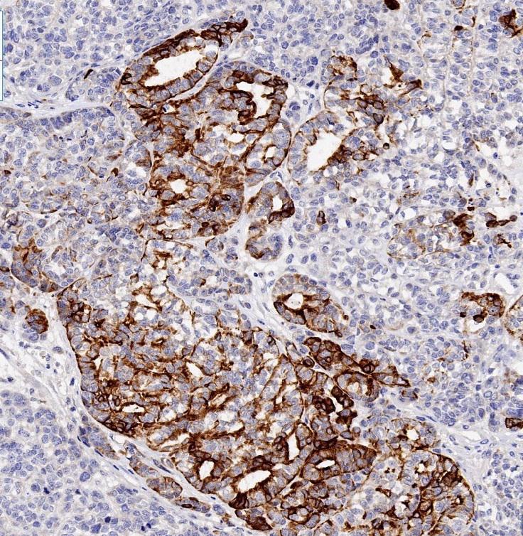 图 5 免疫组化CKp见部分肿瘤细胞呈异质性表达