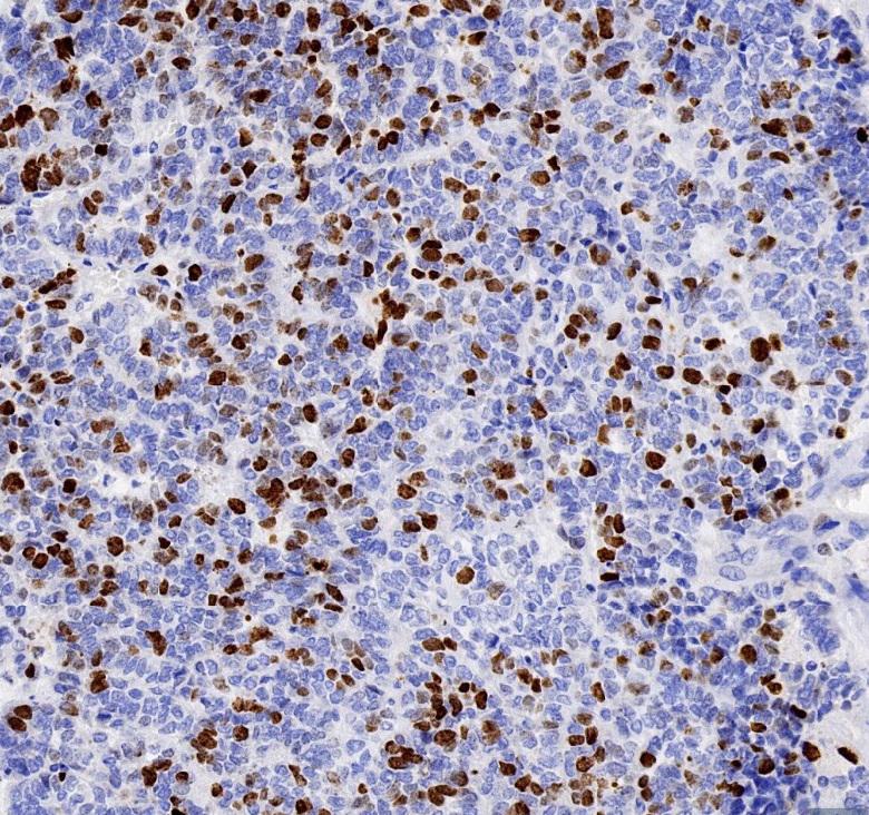 显微镜下可见肿瘤组织形态多样,排列成片状、巢团状,腺样、乳头样、小梁状等特征(图 1~4),肿瘤细胞呈上皮样,细胞核大,细胞浆丰富,部分细胞浆透明,染色质粗大,可见小核仁,肿瘤内有大片凝固性坏死及出血。免疫组化结果显示CKp局灶+(图 5),EMA局灶+,CK8/18局灶+,Vimentin弥漫+,CD56弥漫+,NSE局灶+,CgA-,Syn-,SOX-10-,D2-40-,S100-,GFAP-,IDH1-, CD30-,NeuN-,NF-, Olig2-,CD117-, CD99-, SALL4-, HCG-, PLAP-, Calretnin-, WT1-, CD10-, CD31-, CD34-, MyD1-, AFP-, ER-, PR-, HMB45-, melanA-, SMARCB1/INI-1+, SMARCA2/BRM-, Ki67约40%(图 6)。