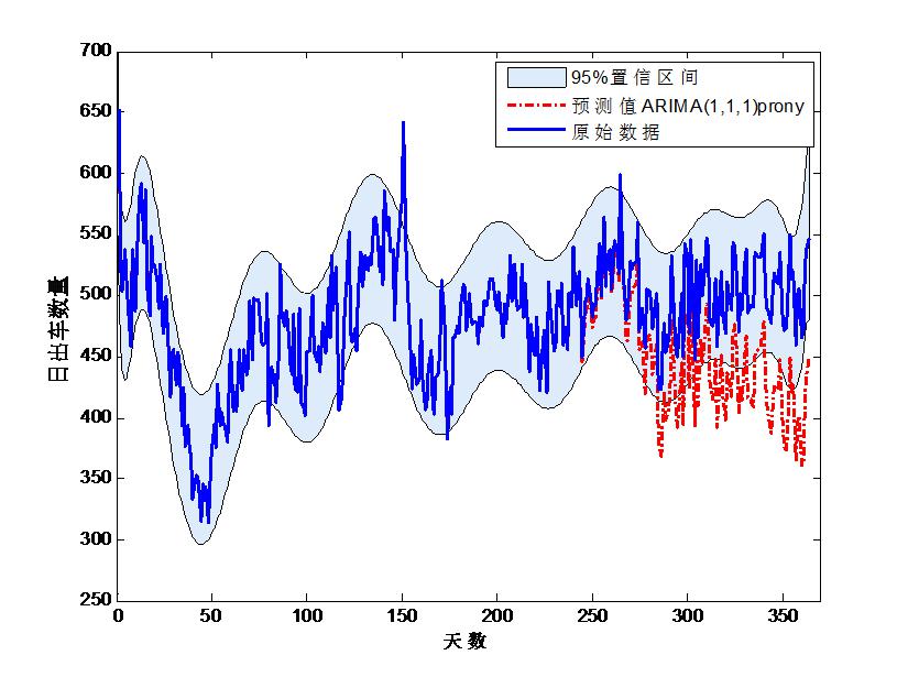 2.3 预测结果及误差分析图 3表示采用ARIMA(1, 1, 1)模型,对未来出车数量的拟合曲线。采用1~8月(243 d)的出车数据作为训练集,估计模型的参数,采用9~12月的数据作为测试集,验证模型的准确性。对于ARIMA中ARMA模型的参数估计采用了Matlab中prony方法,这种方法估算的ARMA模型的分子分母参数分别为[-129, -65.0319],[1, 0.3491]。从图 3可以看出采用ARIMA(1, 1, 1)模型预测的结果短期(30 d内)位于95%置信区间内,随着预测时长的增加,结果误差增加,这是由于ARIMA模型有累计误差。根据式(8)计算ARIMA(1, 1, 1)_prony方法预测9~12月出车量的MAPE为10.56%。