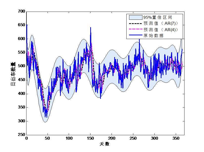 | 图 5 AR模型对日出车时间序列预测曲线 Fig 5 Prediction curve of AR model for the time series of daily departure records |