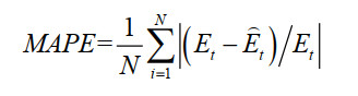 衡量预测模型的好坏用模型预测精度这一指标衡量。模型预测精度可以用平均绝对百分比误差(MAPE)来表示,其表示式如下