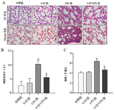 2 结果 2.1 4-OI显著减轻LPS诱导的ALI与对照组相比,LPS造模组小鼠肺组织病理损伤及胶原沉积明显加重,肺损伤评分显著升高(P < 0.05)。而4-OI+LPS组相比于LPS组,小鼠肺损伤情况明显改善,肺湿干重比明显降低,肺组织含水量明显减少,差异具有统计学意义(均P < 0.05),见图 1。
