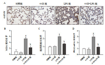 | A:各组小鼠肺组织4-HNW免疫组化(×400);B:ELISA法检测各组小鼠肺组织MDA水平;C:ELISA法检测各组小鼠肺组织铁水平;D:RT-PCR检测铁死亡相关基因PTGS2 mRNA相对表达水平;与对照组比较,aP < 0.05;与LPS组比较,bP < 0.05 图 2 4-OI抑制肺组织脂质过氧化 Fig 2 4-OI inhibited the lipid peroxidation of lung tissue |