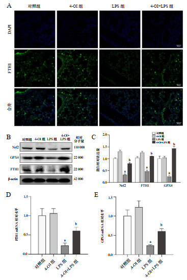1 材料与方法 1.1 主要试剂与材料大肠杆菌O111:B4产LPS(#L2630)购自美国Sigma-Aldrich公司,4-OI、去铁酮(deferiprone, DFP)购自上海MCE公司,一抗铁蛋白重链(ferritin heavy chain, FTH1)(A1144)购自中国Abclonal公司,Nrf2(16396-1-AP)、GPX4(14432-1-AP)、β-actin(60008-1-Ig)、山羊抗兔二抗(PR30009)均购自武汉Proteintec公司,4-羟基壬烯醛(4-hydroxynonenal, 4-HNE)(bs-6313R)购自北京Biosss公司,丙二醛(malondialdehyde, MDA)检测试剂盒(A003-1-2)和组织铁检测试剂盒(A039-2-1)均购自南京建成生物,RIPA裂解液(G2002)、RNA提取液(G3013)、逆转录试剂盒(G3330)、实时PCR(real-timePCR, RT-PCR)试剂盒均购自武汉Servicebio公司。