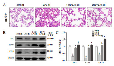 | A:各组小鼠肺组织HE染色(×400);B~C:Western印迹检测肺组织Nrf2、FTH1和GPX4蛋白表达及相对表达水平统计结果;与对照组比较,aP < 0.05;与LPS组比较,bP < 0.05 图 4 4-OI及DFP对肺组织铁死亡相关蛋白的影响 Fig 4 The effect of 4-OI and DFP on ferroptosis-associated proteins. |