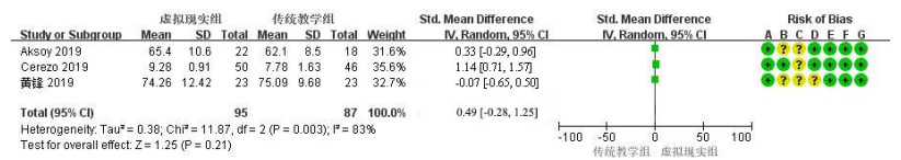 3篇随机对照试验[10-12]将培训后CPR理论成绩作为结局指标,采用随机效应模型进行Meta分析,结果显示两组研究对象的CPR理论成绩差异无统计学意义(SMD=0.49,95%CI: -0.28~1.25,P=0.21,I2=83%)。见图 1