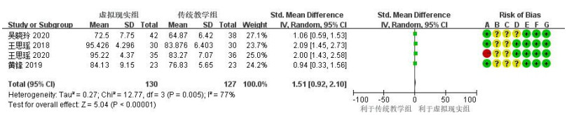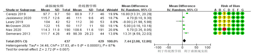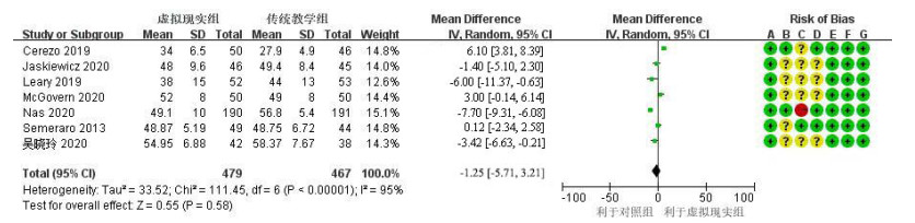 偏倚风险:A为随机序列产生(选择偏倚);B为分配隐藏(选择偏倚);C为参与者和工作人员的盲法(执行偏倚);D为结果评估的盲化(检测偏倚);E为结果数据不完整(损耗偏倚);F为选择性报道(报道偏倚);G为其他偏倚 图 1 VR式培训对CPR理论成绩的影响