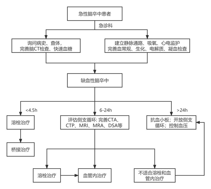 | 图 1 急性缺血性脑卒中血流再灌注急诊处理流程 |