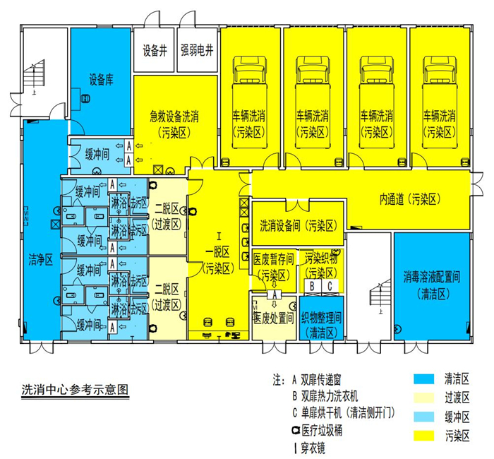 推荐意见4:①洗消中心布局应划分“三区三通道”,“三区”即清洁区、潜在污染区、污染区,各区之间设物理隔离,同时附缓冲通道。“三通道”即人员通道、物品通道、车辆通道,各通道应按照工作流程设计合理的流向。区域间界线清楚,标识明显,各区应安装监控网络摄像头。②各区及通道方向为单向设计,遵循污染区至清洁区的方向要求,污染区内车辆、人员未经洗消不得直接进入清洁区域。③洗消中心应包含的功能分区为洗消区、人员值班与等候区、设备物资库房、管理区、污水处理间及医疗废物间。