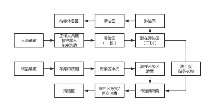 推荐意见13:①人员通道按照人员随救护车驶入车库洗消→工作人员进入污染区一脱→潜在污染区二脱→洗手服及贴身衣物置入传递间消毒→淋浴→清洁区(含卫生间)→待命休息区。②物品通道按照车库内洗消→污染区冲洗→潜在污染区消毒→传递间消毒→缓冲区擦拭或再次消毒→清洁区。具体洗消通道流程见图 2