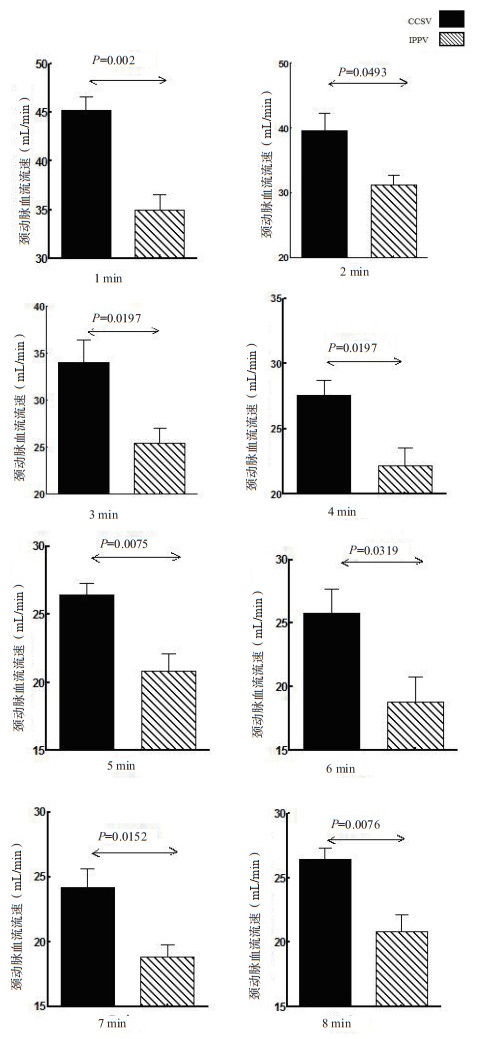 在心肺复苏过程中,监测按压时每分钟颈动脉血流流速,结果显示:在1~8 min内CCSV组猪颈内动脉血流流速明显高于IPPV组(如图 1)。