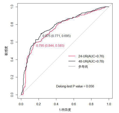 24-UR预测7-AKI的最佳截断值是0.795 mL/(kg·h),ROC曲线下面积(area under ROC curve, AUC)为0.76。48-UR预测7-AKI的最佳截断值是0.975 mL/(kg·h),AUC为0.78。两者在预测AP患者7-AKI发生差异无统计学意义(Delong-test,P=0.056),见图 1。
