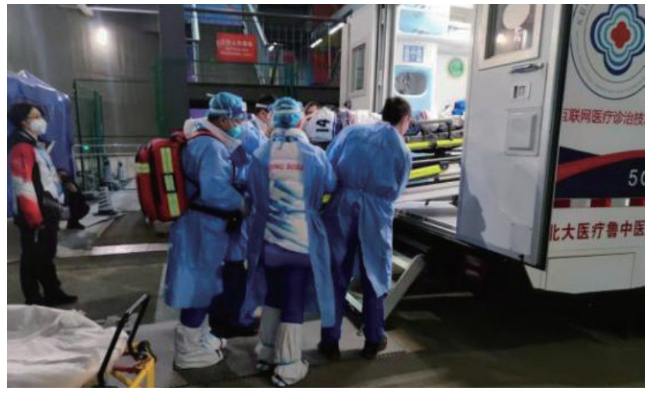 2022年2月3日,北京冬奥会女子冰球小组赛第1天,某国外女冰球队员在对抗中腿部受伤被抬下场诊治后及时转送后方医治(见新华网报道[7]);同日,中国某冰球队员在比赛中遭遇犯规撞倒在场边,被迫下场治疗;2月6日,中国女队在赛中队友间相撞而受伤,伤者由担架抬出场外。这些受伤的运动员都得到了及时的诊断与救治。运动员在受伤后,FOP医疗站医生进行初步判断,(1)遇明显颌面伤情,则转移伤员至牙科诊室,医生根据伤情判断,第一时间在场馆5G移动CT救治单元站点进行CT扫描,根据检查结果作进一步诊断及处理;(2)遇不明伤情(例颅脑损伤、四肢末端伤等),第一时间在场馆5G移动CT救治单元站点进行CT扫描,运动员医疗站医生根据检查结果作进一步诊断及处理。伤情较轻,经简单处理及观察后,伤员视情况休息或继续参与赛事;伤情较重,启动5G远程会诊,判断现有条件下无法进行更多处理或需要进行手术,立即派遣场馆转运救护车转运伤员到定点专科医院,各类人员按固定的线路走,相互不交叉、不重叠,保持安全社交距离。保障现场见图 5。