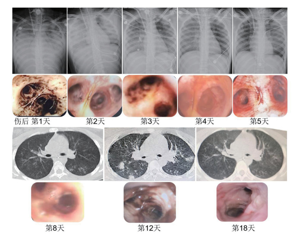 入院后根据容量监测结果进行目标导向性的液体复苏,使用持续肾脏替代(CRRT)、目标性镇静(脑电双频指数45-60)镇痛(CPOT评分0分)、雾化吸入(布地奈德混悬液2 mg、异丙托溴铵溶液500 μg,每日3次)等治疗。每日进行纤维支气管镜检查,床边胸片评估肺部情况(图 1)。第2天开始每日俯卧位通气16~18 h持续3 d,肺部情况逐渐改善(表 1、图 2)。第7天评估后达到ECMO撤机标准,顺利撤除ECMO(共支持146 h)。第6天开始患者气道少量坏死黏膜组织脱落,第14天到达高峰,第22天坏死黏膜组织脱落基本消失,期间患者反复出现呼吸窘迫、氧合水平下降、气道高压报警,紧急行床边纤维支气管镜检查、去除堵塞气道的坏死黏膜组织后改善。通过多模态神经监测及脑保护,患者于第12天意识转清,分别于第16天行“双下肢、臀部躯干削痂术+双下肢臀部负压封闭引流术(皮下)”,第23天行“四肢皮肤和皮下坏死组织切除清创术+四肢躯干刃厚皮片移植术+双上肢削痂术+躯干削痂术+头部左下肢皮片取皮术+四肢躯干负压封闭引流术”。第28天成功撤除呼吸机,第29天转烧伤科普通病房,第49天转康复医院。整个救治过程中患者感染控制良好。伤后第157天患者因气管塌陷行气管支架植入术,随访至今神志清楚,情绪稳定,语言能力佳,肢体功能正常,生活自理。
