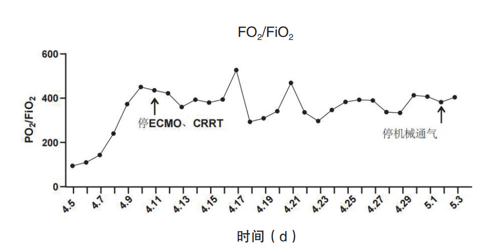 1 资料与方法患者,女性,16岁,因“火焰烧伤致神志不清30 min”于2021-04-05 05:10来院。患者因发生火灾被困在密闭的卫生间约70 min,被消防员救出时意识不清,全身多处烧伤,由救护车送入本院急诊。查体:昏迷,心率169次/min,血压118/80 mmHg(1 mmHg=0.133 kPa),呼吸32次/min,脉搏氧饱和度76%(储氧面罩10 L/min)。两肺可闻及明显湿性啰音。面部3%浅Ⅱ度、双上肢4%深Ⅱ-Ⅲ度、双下肢21%深Ⅱ-Ⅲ度、躯干4%深Ⅱ-Ⅲ度烧伤。身高160 cm,体重50 kg, 既往体健。急诊予以气管切开、机械通气(容量控制模式,潮气量300 mL,呼吸频率18次/min,氧体积分数100%,呼气末正压10 cmH2O),纤维支气管镜检查和肺泡灌洗, 根据烧伤补液公式行液体复苏治疗。动脉血气分析提示:pH 7.208,氧分压74.6 mmHg,二氧化碳分压51.8 mmHg,碳氧血红蛋白15.9%,乳酸8.9 mmol/L。在100%氧体积分数和保护性肺通气策略支持下,无法维持氧合指数大于80 mmHg,急诊行静脉-静脉体外膜肺氧合(V-V ECMO)支持。采用MAQUET体外心肺机(迈柯维公司, 德国)及套包,经皮右股静脉插入22 F静脉引流导管,右颈内置入16 F回流导管,设置参数:3000转/min,血流量3.1 L/min,气流量3.0 L/min,氧体积分数100%。调整呼吸机参数为潮气量300 mL,频率12次/min,吸入氧体积分数50%,呼气末正压10 cmH2O,转入EICU。入院5 h,尿量0 mL。入院诊断:①重度烧伤(Ⅱ度-Ⅲ度,32%体表面积,含角膜损伤);②重度吸入性损伤;③急性一氧化碳中毒;④多脏器功能衰竭(中枢,呼吸,肾脏)”。第1天的急性生理与慢性健康评分Ⅱ为18分,SOFA评分15分,Murry评分3.5分。