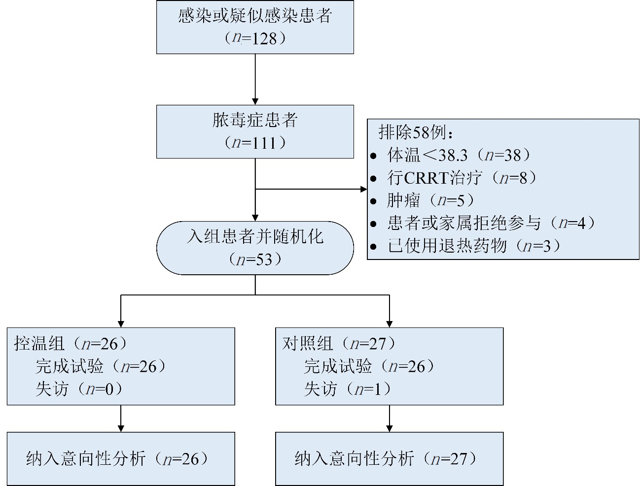 2 结果 2.1 入组流程研究期间共128例感染或疑似感染患者入住苏北人民医院ICU,其中根据Sepsis 3.0诊断标准为脓毒症患者111例,依据纳入排除标准排除58例:体温小于38.3℃患者38例,行连续性肾脏替代治疗患者8例,肿瘤患者5例,患者或家属拒绝参与4例,入组前已使用退热药物患者3例。最终53例患者纳入研究,26例被随机分配到控温组,27例随机分配到对照组,控温组全部完成28 d随访,对照组1例失访。入组流程见图 1。