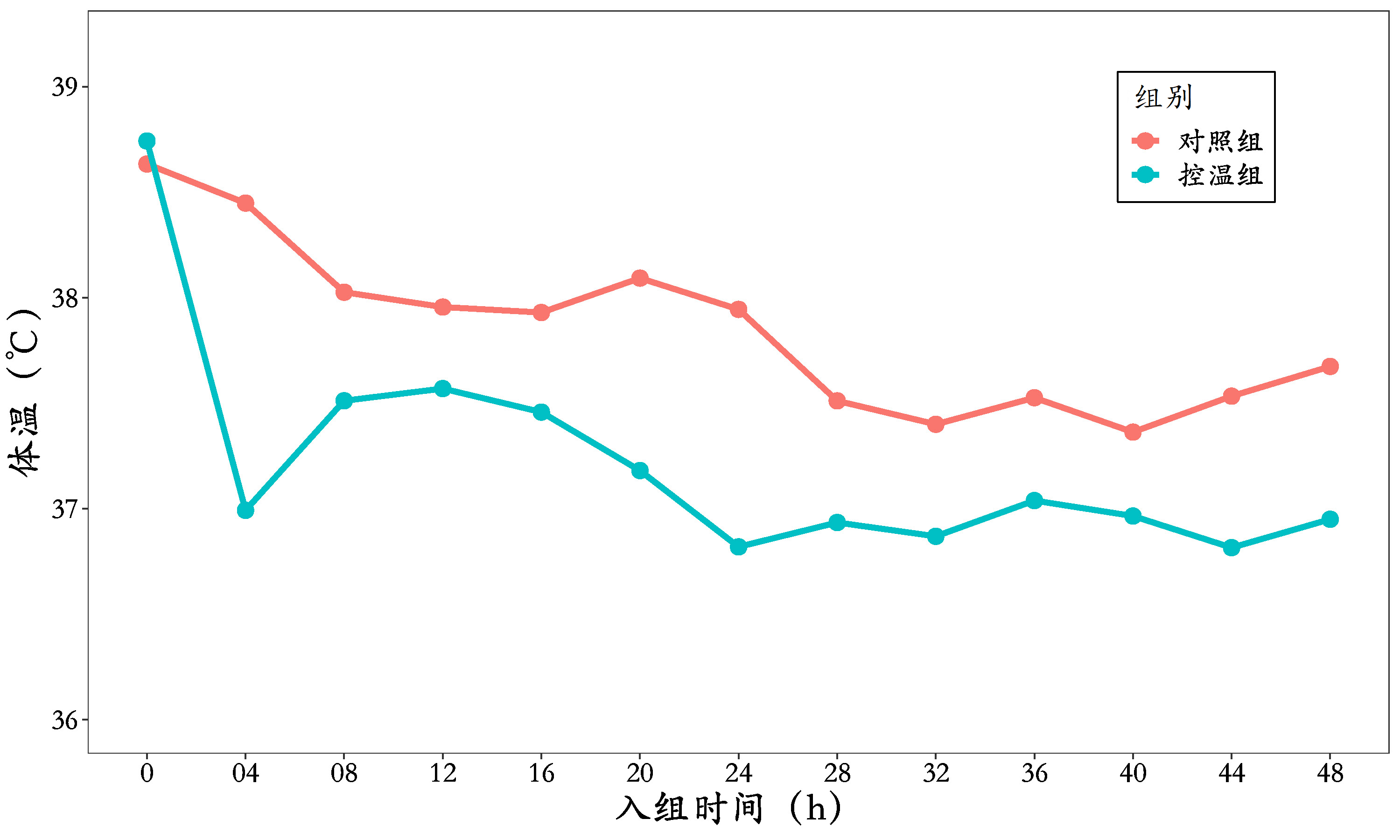 | 图 2 两组患者入组48 h体温变化 Fig 2 Temperature changes of patients in both groups within 48 h after enrollment |