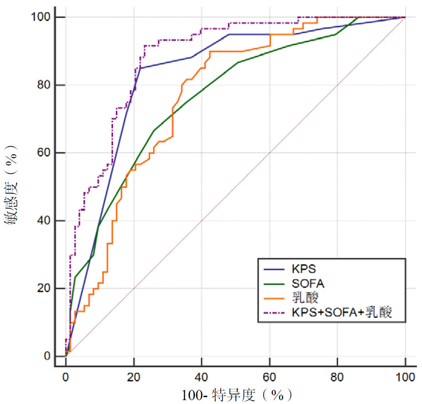 | 图 1 KPS评分、SOFA评分和动脉血乳酸与患者住院期间病死率ROC曲线 Fig 1 ROC curves of KPS score, SOFA score, arterial blood lactate and in-hospital mortality |