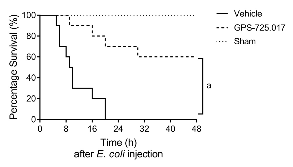 | 建模及治疗后48 h,GPS-725.017治疗组小鼠生存率显著高于溶剂组(n=10),aP < 0.01;Vehicle为溶剂组、GPS-725.017为GPS-725.017治疗组、Sham为假手术组 图 1 感染小鼠生存率分析 Fig 1 Kaplan-Meier survival analysis of infected mice |