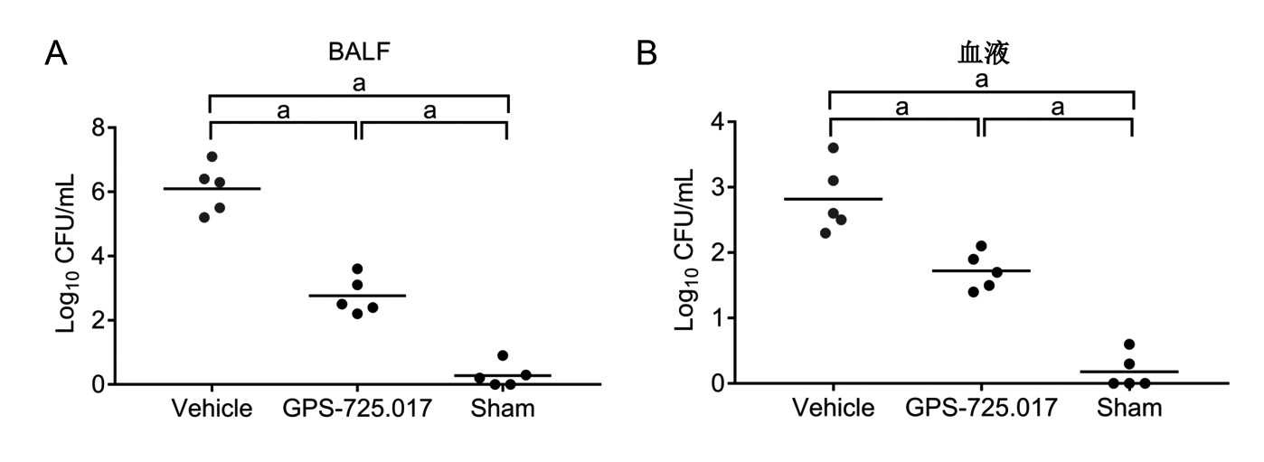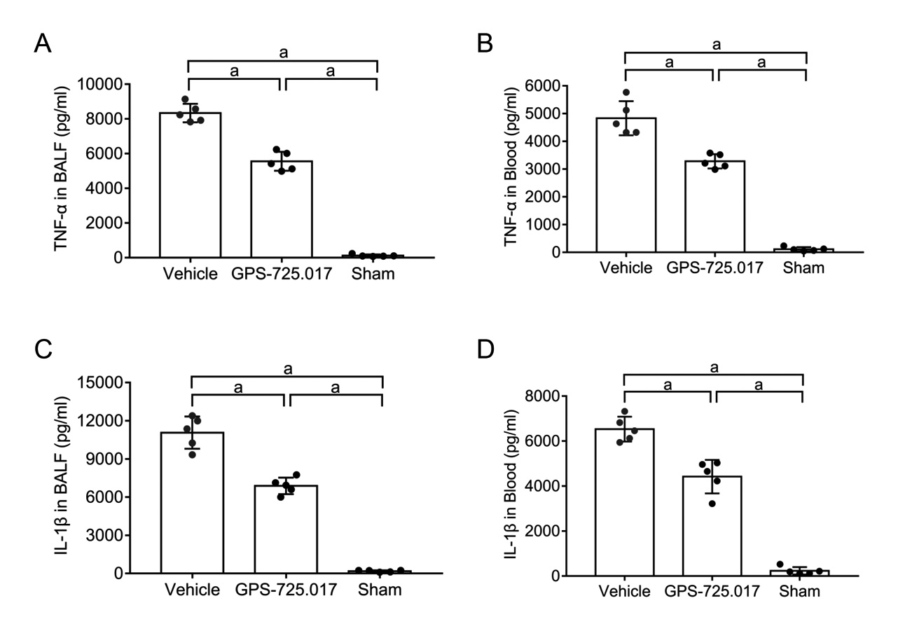 1.2.4 外周血及肺脏细菌负荷及炎性因子检测假手术组、GPS-725.017治疗组及溶剂组(每组n=5)分别于ALI模型后5 h,按400 mg/kg的剂量通过腹腔注射麻醉剂(4%水合氯醛),进行麻醉。采用心脏釆血法,收集小鼠全血于抗凝管。抽取500 μL PBS对小鼠进行支气管肺泡灌洗,连续3次。将所得全血以及肺泡灌洗液(bronchoalveolar lavage fluid, BALF)进行梯度稀释,LB平板涂板,置于37℃培养箱中,过夜培养,并计数细菌,计算出单位体积血液或肺泡灌洗液中CFU。利用ELISA试剂盒检测各组小鼠血液及肺泡灌洗液中炎性因子的含量。