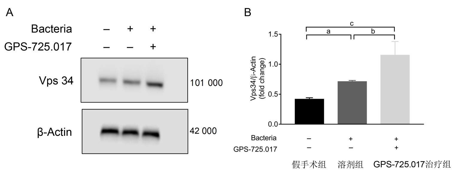 本研究对前期的多肽进一步优化,在Nle-R-P-Y短肽基础上,在其N末端连接一个myr,C端酸化修饰,生成一种新型的S1PR3激动肽,并命名为GPS-725.017。前期体外研究证明,GPS-725.017通过调控S1PR3,活化下游MAPKs通路,具有较强的激动作用[7],然而在体内的作用并不明确。本研究模拟临床患者感染性肺炎所致ALI的发病过程,通过向小鼠气管内注射大肠杆菌,诱导ALI模型[16],以证实GPS-725.017对细菌性肺损伤小鼠的治疗作用。研究结果显示:建模及治疗后48 h,GPS-725.017治疗组小鼠生存率显著高于溶剂组;GPS-725.017治疗5 h后,GPS-725.017治疗组小鼠肺脏及外周血细菌负荷更少,肺脏炎症因子及病理学损伤程度水平更低。在相关杀菌分子机制研究方面,GPS-725.017组小鼠的肺泡巨噬细胞内Vps34蛋白表达水平明显上调。