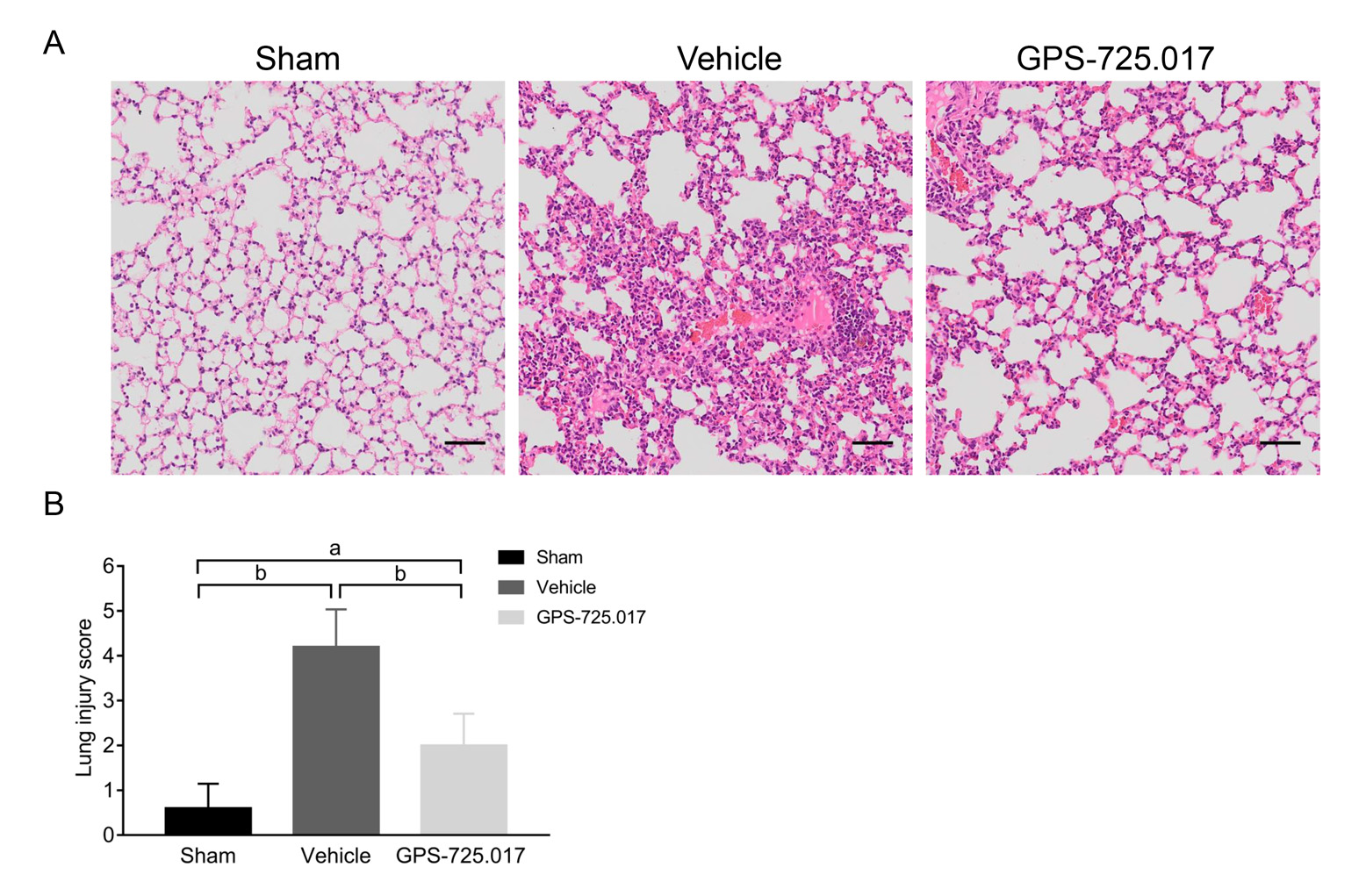 为评估GPS-725.017对ALI小鼠肺脏损伤的改善情况,在GPS-725.017治疗后12 h取某一肺叶于4%甲醛固定、制作切片以及进行H & E染色,显微镜下拍照后对肺脏进行组织学评分(n=5)。结果发现,溶剂组有明显ALI的病理改变,包括弥漫性肺泡损伤、肺泡充血、大量炎症细胞浸润等;GPS-725.017治疗后肺损伤明显减轻,差异具有统计学意义(P < 0.001)。见图 5。