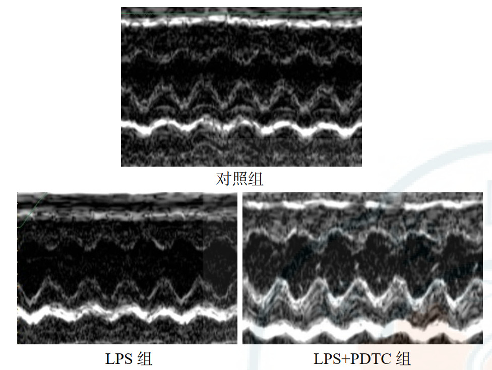 用超声心动图评价LPS给药和PDTC预处理对大鼠左心室功能的影响。与对照组相比,LPS组大鼠的HR减慢(P < 0.05),SV、EF、LVFS、CO显著降低(P < 0.01)。与LPS组相比,LPC+PDTC组SV、HR、EF、LVFS、CO均显著升高(均P < 0.05)。结果表明LPS诱导的脓毒症大鼠心脏收缩功能明显受损,发生心功能障碍;PDTC预处理可显著减轻LPS所致的收缩功能损害。见表 2、图 1。