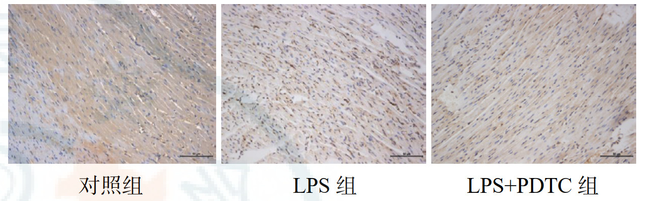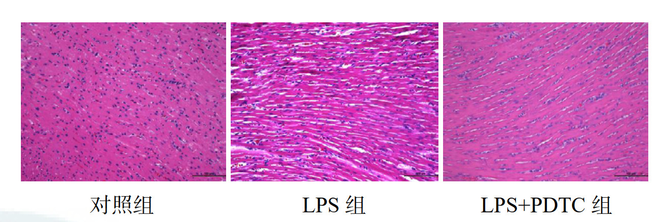 为评估LPS诱导的脓毒症大鼠及PDTC预处理后大鼠心肌组织病理学变化,对各组大鼠心肌组织进行HE染色。与对照组相比,LPS组可见到明显炎症细胞浸润,心肌细胞水肿,肌原纤维排列紊乱甚至心肌纤维断裂,出现核碎裂、溶解和消失等改变。与LPS组相比,LPS+PDTC组心肌炎症细胞浸润程度减轻,肌原纤维排列紊乱甚至心肌纤维断裂现象及细胞核的改变也明显改善,提示PDTC预处理明显改善了LPS所致的大鼠炎症反应和心肌细胞损伤。见图 2。