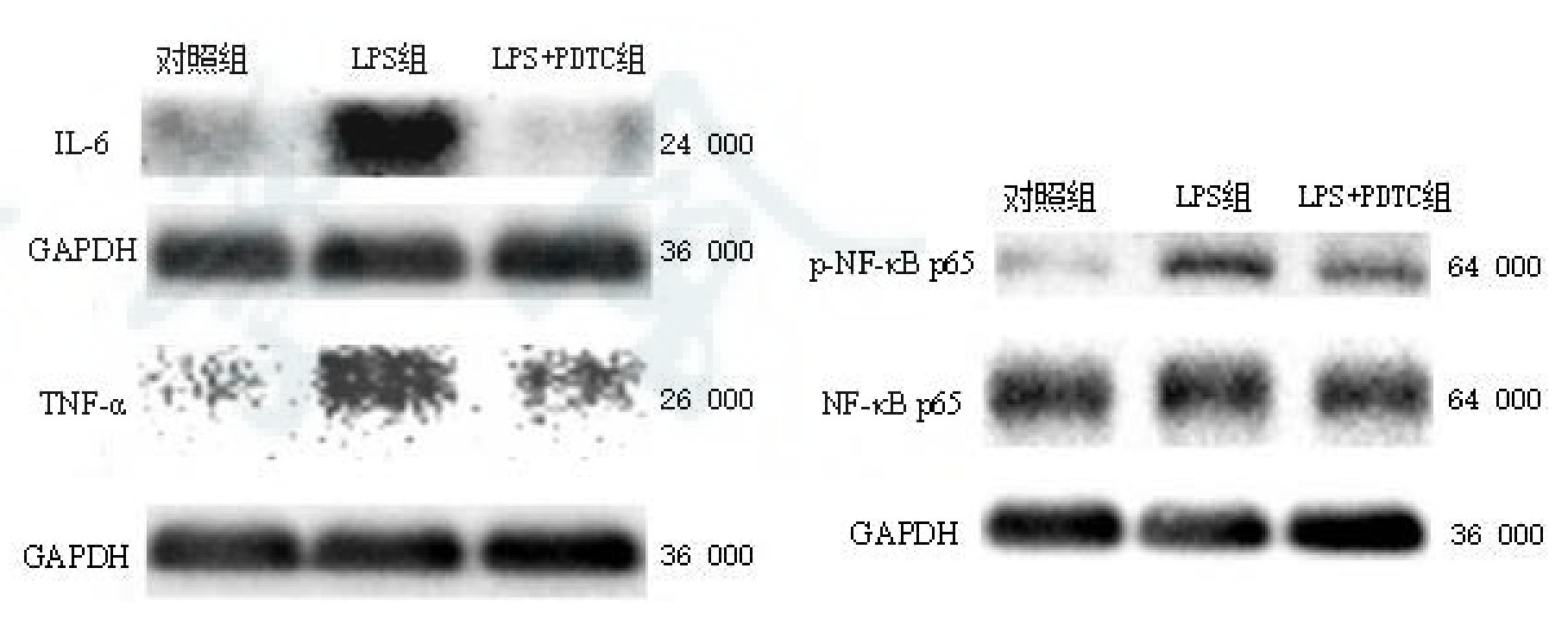 与对照组相比,LPS组心肌组织中TNF-α、IL-6蛋白含量明显增加(均P < 0.01)。与LPS组相比,LPS+PDTC组心肌组织中TNF-α、IL-6显著减少(均P < 0.01)。表明LPS可刺激脓毒症大鼠心肌组织中炎症细胞因子(TNF-α、IL-6)含量明显增加,同时PDTC预处理可显著减低由LPS诱导的脓毒症大鼠心肌组织中TNF-α、IL-6水平,即减轻心肌组织炎症水平。见表 1,图 4。