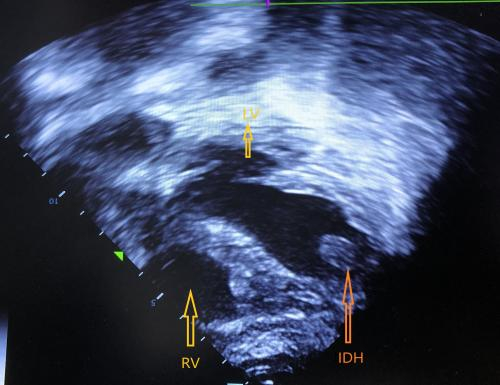 | IDH为心肌内解剖血肿,LV为左心室,RV为右心室 图 1 患者第6日超声心动图 |