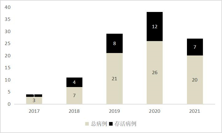 从2017年至2021年,使用ECMO对中毒患者的治疗逐渐增加,在2017年,只登记了2例中毒ECMO病例,在2020年达到顶峰,共38例。各个年份存活率差异无统计学意义(P=0.794)(图 3)。