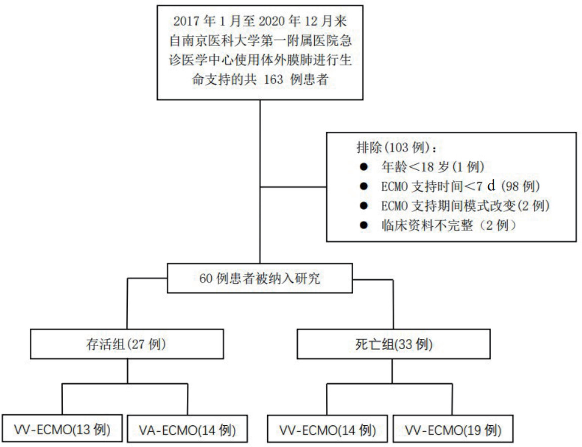 回顾性收集2017年1月至2020年12月来自南京医科大学第一附属医院急诊医学中心使用ECMO的163例患者的临床资料。纳入标准:(1)年龄≥18岁;(2)ECMO支持时间≥7 d;(3)临床资料完整。排除标准:(1)年龄<18岁;(2)ECMO支持时间<7 d;(3)ECMO支持期间模式改变;(4)ECMO用于术中生命支持;(5)临床资料不完整。最终纳入60例患者(图 1)。本研究获得医院伦理委员会审批,审批号为2021-SR-355。收集患者的基线资料,包括性别、年龄、合并症、ECMO模式及支持时间、住院时间、机械通气时间、观察期间血小板总输注量、白细胞(WBC)、血红蛋白(HB)、血小板压积(PCT)、尿素氮(BUN)、活化部分凝血活酶时间(APTT)、纤维蛋白原(FIB)、ECMO上机28 d生存结局等。