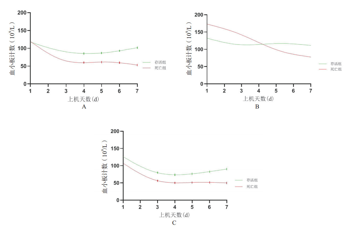 A:总ECMO人群B:VV-ECMO C:VA-ECMO 图 2 存活组与死亡组在上机7 d内血小板基线值变化趋势比较 Fig 2 Comparison of baseline platelet values between the survival group and death group within 7 days after operation