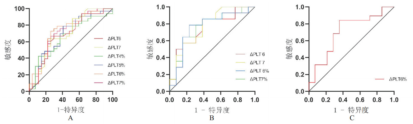 将组间比较存在差异的血小板变化值及变化率进行ROC曲线分析,在总ECMO人群中,以第6天的血小板变化率对患者28 d结局预测效果最佳(AUCΔPLT6%=0.735, P=0.002, 表 3, 图 2A),当血小板变化率以-26.19%为临界值时,敏感度为0.727,特异度为0.741;在接受VV-ECMO患者中,以第7天的血小板变化值及变化率对患者28 d结局预测效果最佳(AUCΔPLT7=0.772, P=0.016; AUCΔPLT7%=0.764, P=0.020, 表 3, 图 2B),当血小板变化值以4×109/L为临界值时,敏感度为0.857,特异度为0.615,当血小板变化率以为-28.99%为临界值时,敏感度为0.643,特异度为0.846;在接受VA-ECMO患者中,以第6天的血小板变化率对患者28 d结局预测效果最佳(AUCΔPLT6%=0.707, P=0.045, 表 3, 图 2C),当血小板变化率以-26.19%为临界值时,敏感度为0.842,特异度为0.643。