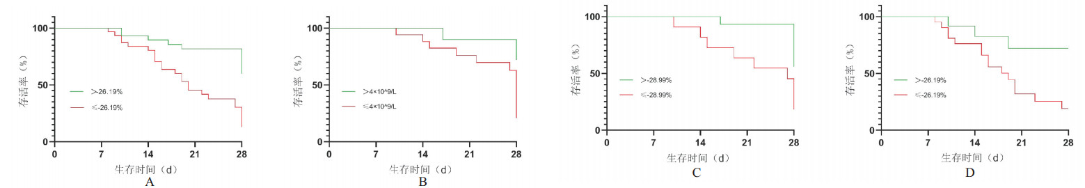根据相应临界值进行分组,结果显示小于或等于临界值患者28 d病死率明显高于大于临界值分组患者,且生存时间较大于临界值分组患者显著缩短,见表 4, 图 4