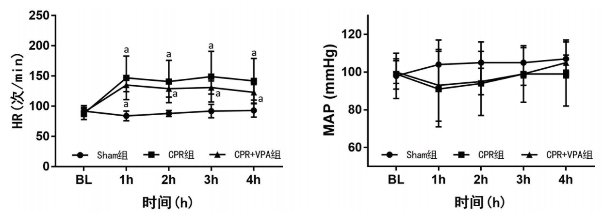 | HR:心率;MAP:平均动脉压;BL:基线;Sham:假手术;CPR:心肺复苏;VPA:丙戊酸钠; 与Sham组比较,aP < 0.05 图 1 各组动物血流动力学参数的变化 Fig 1 The changes of hemodynamics in each group |