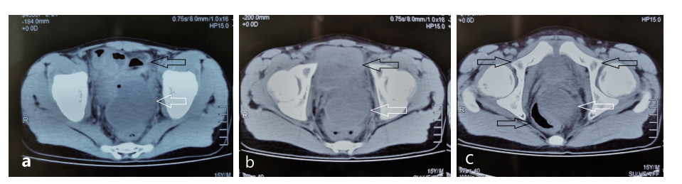 1 资料与方法 1.1 一般资料患者马某某,男,15岁,2019年9月10日以“阑尾切除术后伴腹痛发热6 d”入院。患者8 d前无明显诱因下出现右下腹痛,考虑“急性阑尾炎”,6 d前在当地医院行“阑尾切除术”,术后患者下腹部有持续性疼痛,伴有发热,最高39.3℃,查腹部CT显示:盆腔深部脓肿(图 1),给予抗感染治疗效果不佳,转至蚌埠医学院第一附属医院急诊外科。