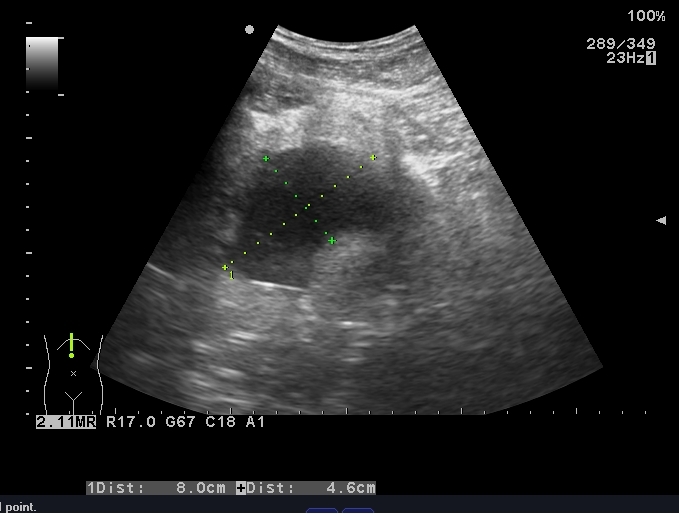| 图 2 盆腔超声显示:骶前间隙可见一80 mm×46 mm的无回声区,内可见斑点样中强回声 |
