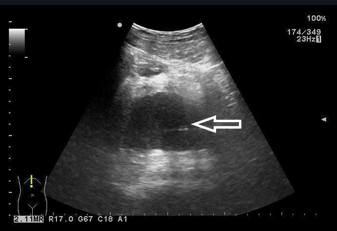| 图 6 超声显示引流管弯曲在脓腔内 |