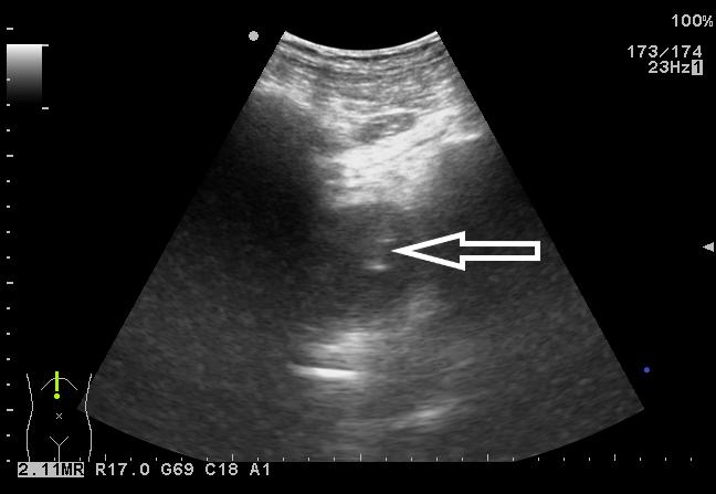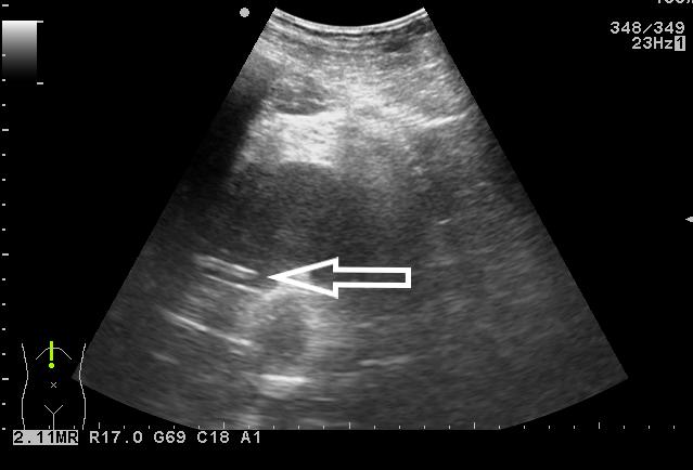 | 图 3 超声引导下PTC针破壁进入脓腔 |