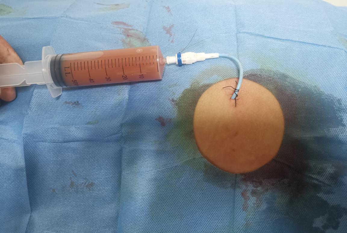 | 图 5 引流段联合支撑管成功置入脓腔 |