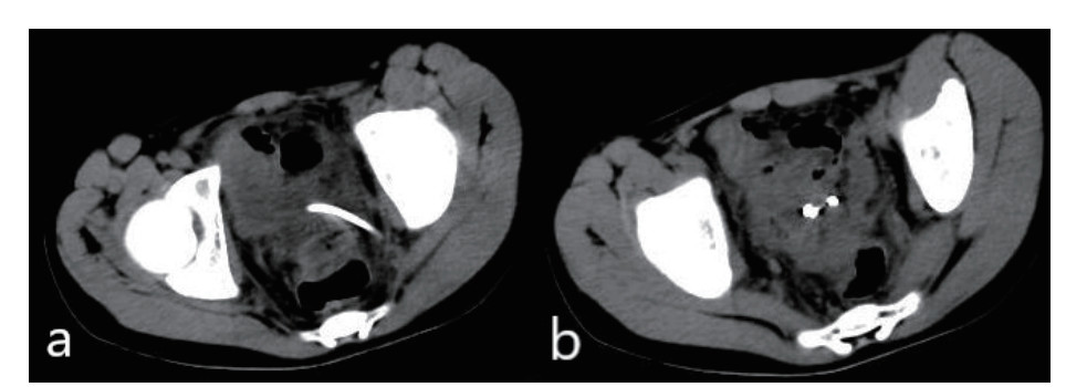 | 图 8 术后腹腔CT显示:盆腔可见引流管影,引流管周围未见明显积液 |