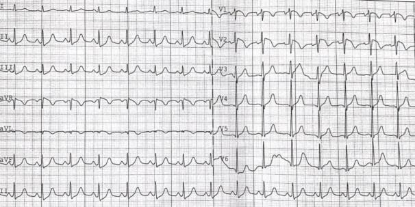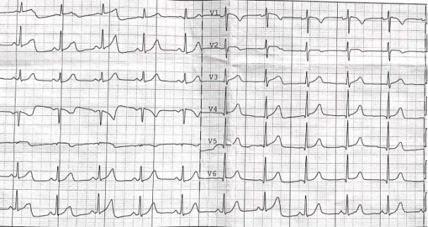 患者男,66岁,汉族。因“呕吐腹泻伴发热2 d”急诊就诊。体格检查:体温40.2 ℃,心率101次/min,呼吸18次/min,血压103/59 mmHg(1 mmHg=0.133 kPa),神志清,精神可,心肺听诊未及明显病理性杂音。腹软,剑突下压痛,麦氏点、墨菲氏征阴性。四肢活动可。心电图检查:窦性心律,V1-V2 ST-T段上抬,呈穹窿样抬高,末段逐渐降低呈下斜型,T波倒置,考虑BrugadaⅠ型波(图 1)。血常规:白细胞:3.05×109/L,血红蛋白70 g/L,血小板:191×109/L, 超敏C反应蛋白(CRP)285.24 mg/L,降钙素原(PCT):10.9 ng/mL,β-1, 3-D葡萄糖:974.6 pg/mL, 钙卫蛋白112 μg/g,艰难梭菌阴性,沙门菌志贺菌阴性,粪便轮状病毒(金标法)阴性,心肌酶谱及血清肌钙蛋白均在正常水平。心脏超声:AOL:32 mm,IVSd:9 mm,LVDd:54 mm,FS:30%,HR:55 BPM,LA:28 mm,LVPWd:9 mm,LVDs:38 mm,LVEF55%,主瓣退变,左室舒张功能减退,三尖瓣轻度反流。腹部CT:未见明显异常,肺部CT:右肺中叶炎症伴实变,左肺上叶及右肺下叶胸膜下少许炎症。既往有骨髓瘤病史,规律血液科化疗,否认有胸痛、晕厥、冠心病病史,否认家族中有晕厥及心源性猝死病史。立即调阅患者既往住院心电图资料(图 2),未提示有Brugada表现,予以心电监护,同时予吲哚美辛栓退热,复方氯化钠补液以及头胞哌酮舒巴坦抗感染等治疗后,体温逐渐下降,每下降约1摄氏度记录一次心电图,发现随着体温下降心电图逐渐恢复正常(图 3~5)。患者住院期间,两次血培养提示:肺炎链球菌,根据药敏结果予头胞哌酮舒巴坦及利奈唑胺抗感染等治疗后,病情好转。复查相关检查:血常规、CRP、肺部CT等逐渐恢复正常水平,且在院期间多次复查心肌酶及血清肌钙蛋白,均在正常范围。