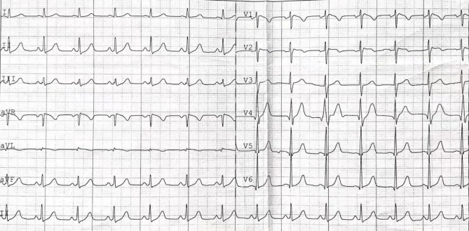 图 1 患者体温39℃时心电图为BrugadaⅠ型波表现