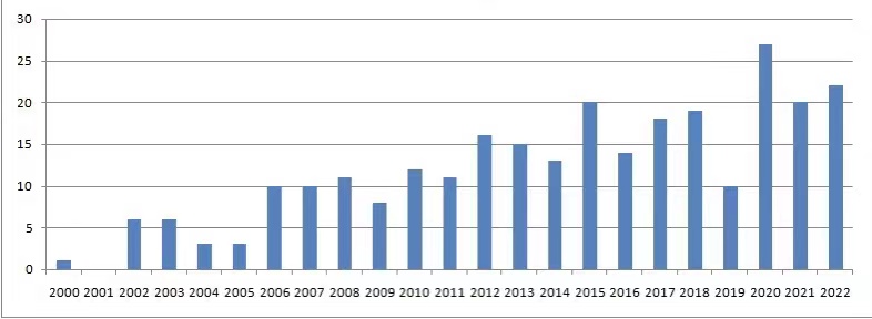 图 6 2000—2022年与发热诱发Brugada综合征相关的文章数量