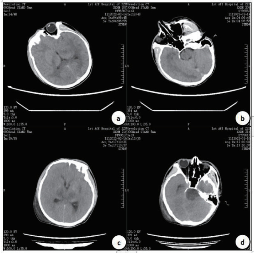 | 入院时头颅CT(a、b),入院61 h后头颅CT(c、d)示:脑实质灰白质分界不清,脑沟、脑裂变浅,部分脑池变窄,枕大池显示不清,丘脑、脑干密度减低,小脑扁桃体似向下移位,小脑幕及大脑镰密度稍增高,中线结构居中。 图 1 病例1的CT结果 Fig 1 CT results of Case 1 |