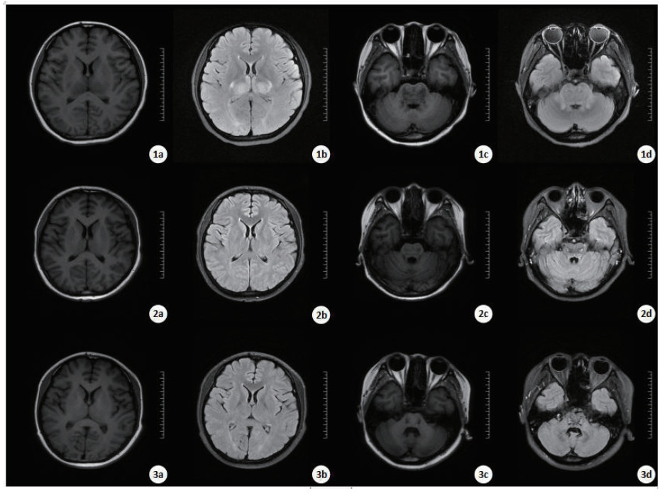 | 入院第7天的MRI显示,T1WI(1a和1c)、T2WI(1b和1d): 胼胝体压部、双侧丘脑、双侧基底节区、脑干异常信号。第60天、第105天MRI显示,T1WI(2a和2c、3a和3c)、T2WI(2b和2d、3b和3d): 左侧额叶、右侧顶叶见少许点片状稍长T2信号影,黑水像呈稍高信号。桥脑及中脑可见对称性斑片状长T1长T2信号影,黑水像中心呈高信号,边缘环绕低信号。 图 2 病例2的MRI结果 Fig 2 MRI results of Case 2 |