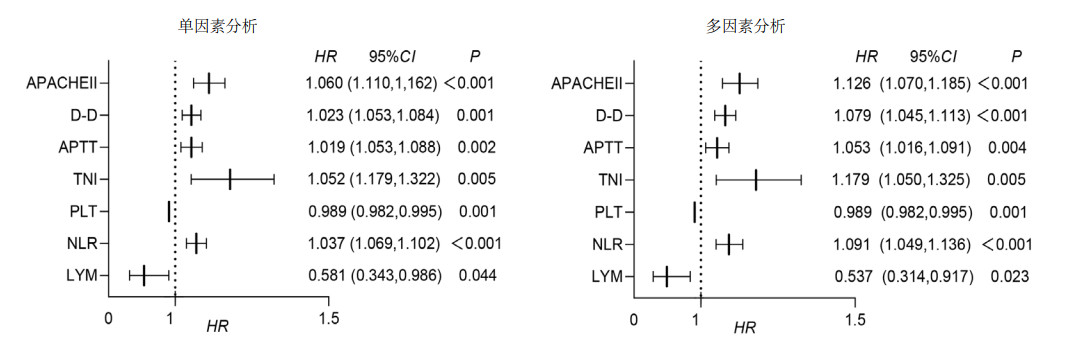 | 注:NLR为中性粒细胞/淋巴细胞比值,PLT为血小板计数,TNI为肌钙蛋白,APTT为活化部分凝血活酶时间,D-D为D-二聚体,APACHEⅡ评分为急性生理与慢性健康Ⅱ评分 | ||||||